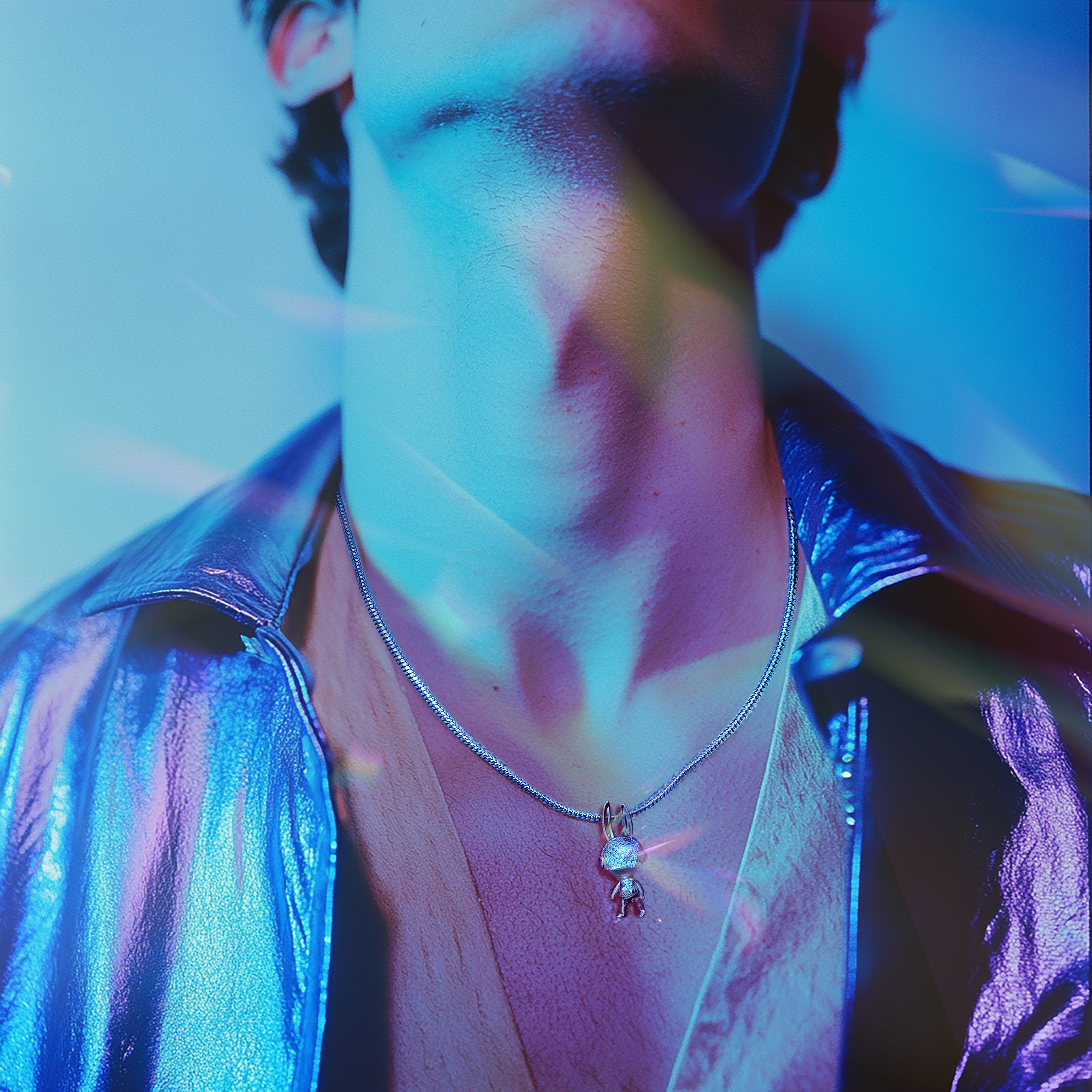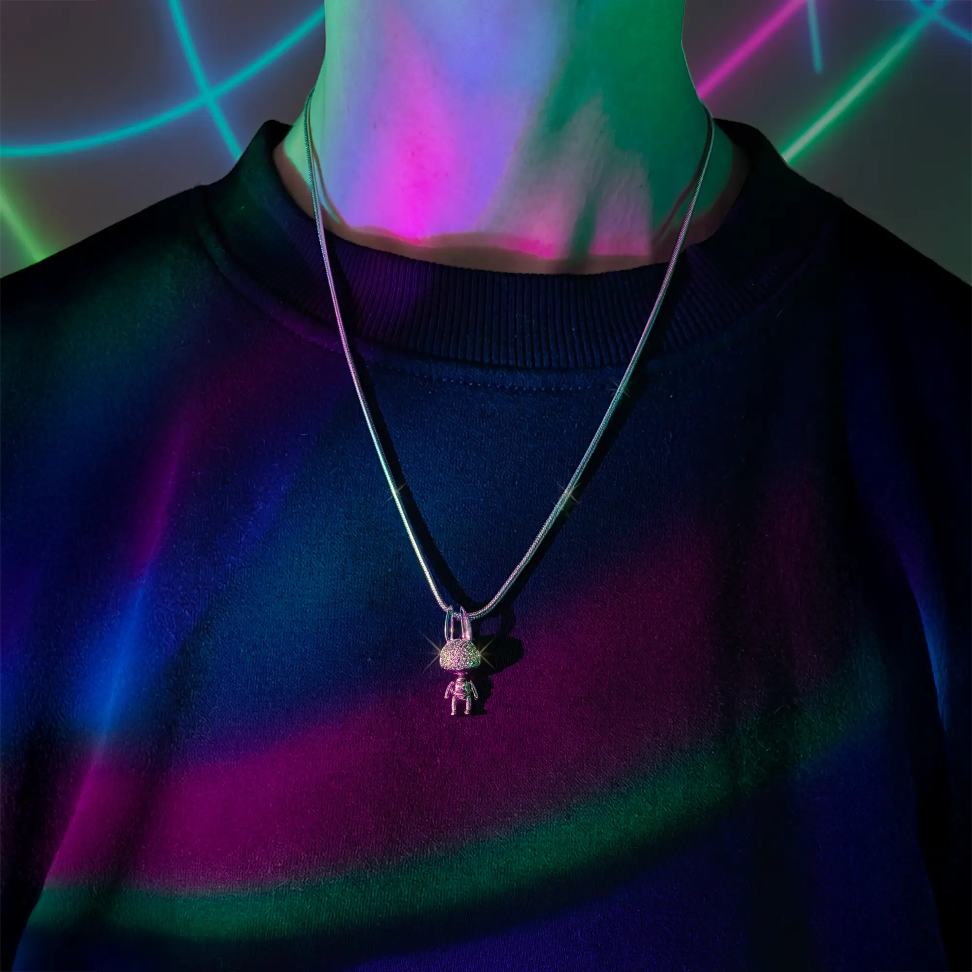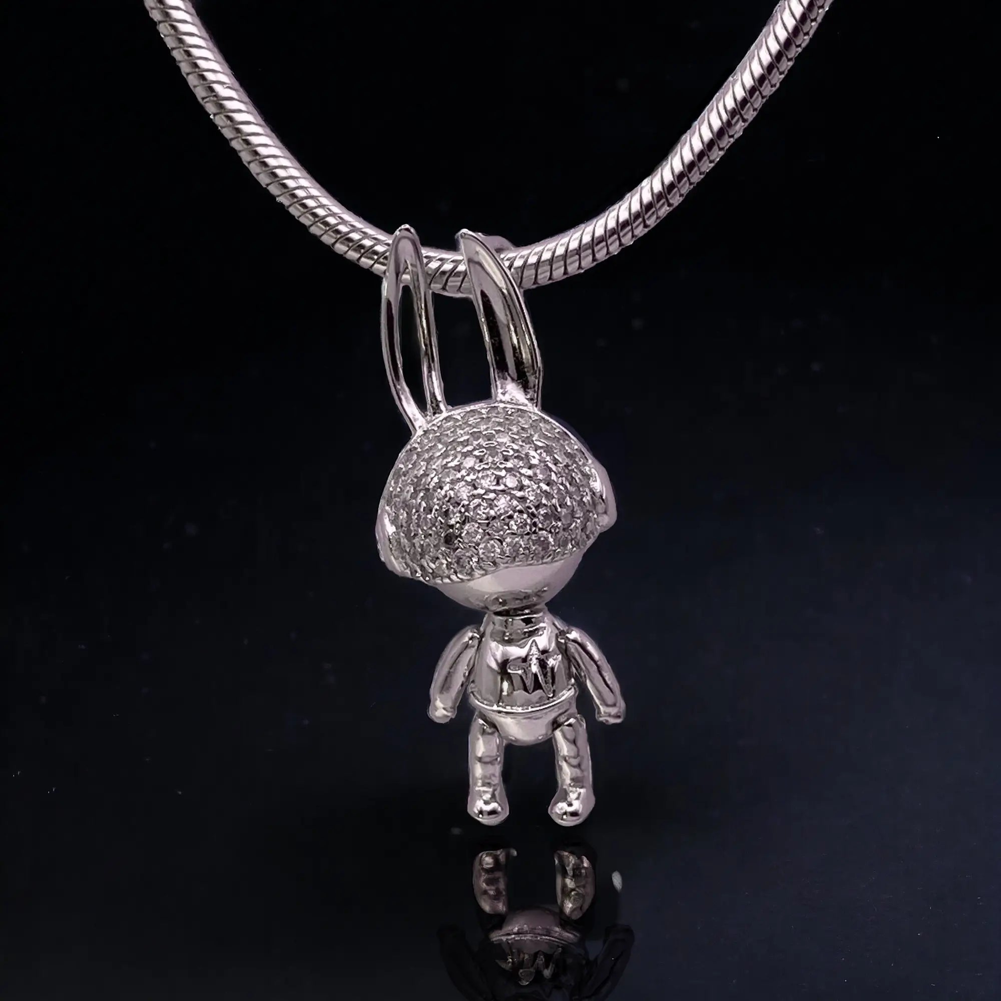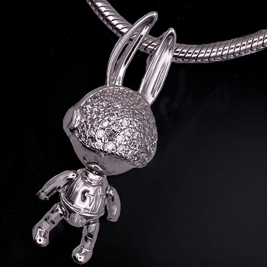 Hop into the void. This isn't a static pendant—it's alive. The articulated bunny, forged from premium 925 silver and crowned with brilliant moissanite eyes that blaze like distant stars, lets you pose its ears and limbs with a gentle touch. Imagine it dangling against your chest as you speed through rain-slicked streets at 3 a.m., neon reflections dancing across its joints like a glitch in the matrix. Ethically sparkling, playfully rebellious, forever yours.